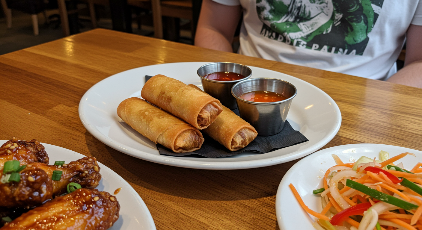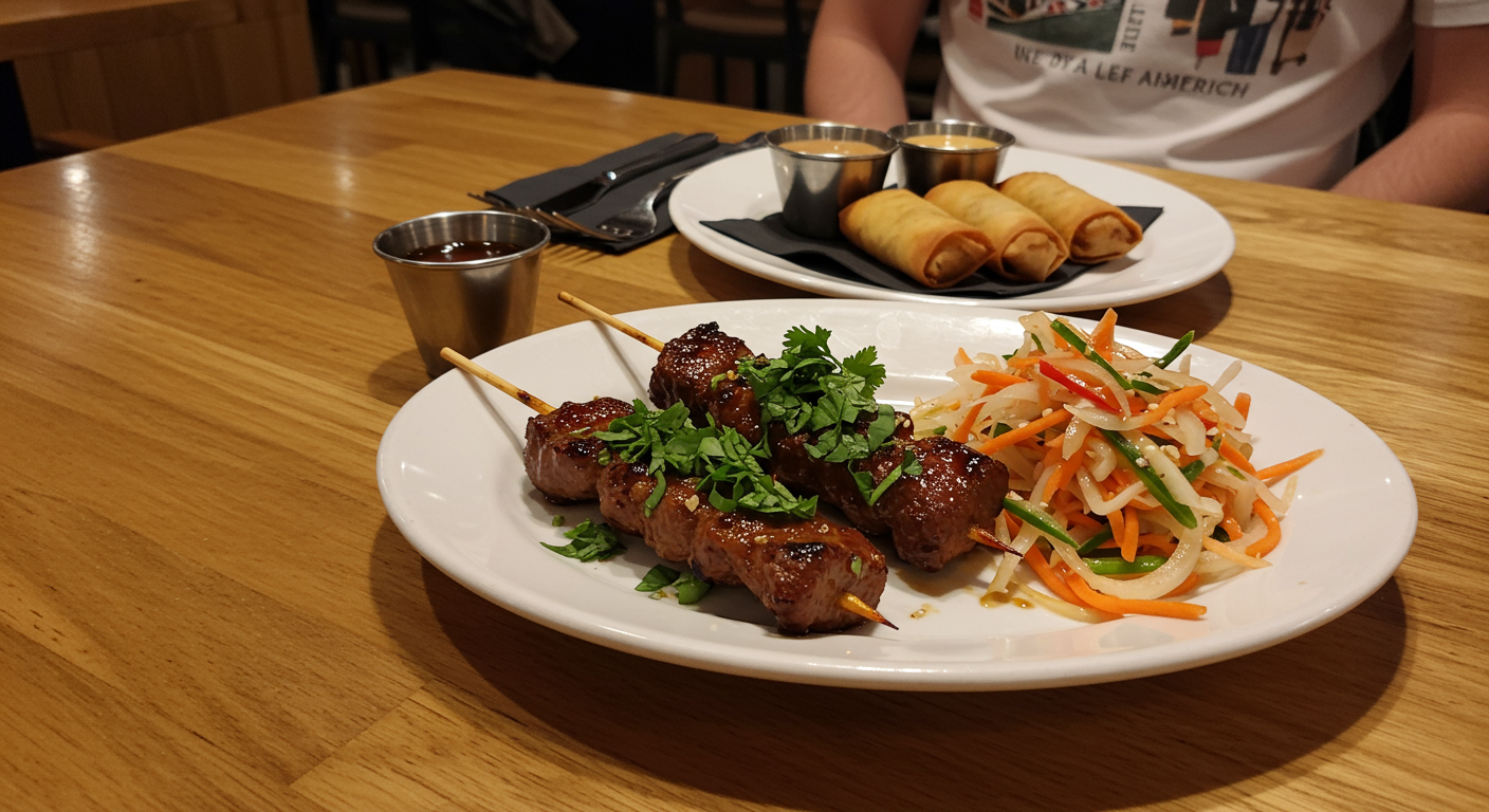 We started our meal with a trio of appetizers: lumpia, fried calamansi wings, and savory ribeye skewers. The lumpia, similar to spring rolls, were delicate and filled with flavor—though just five on the plate left us wanting more.